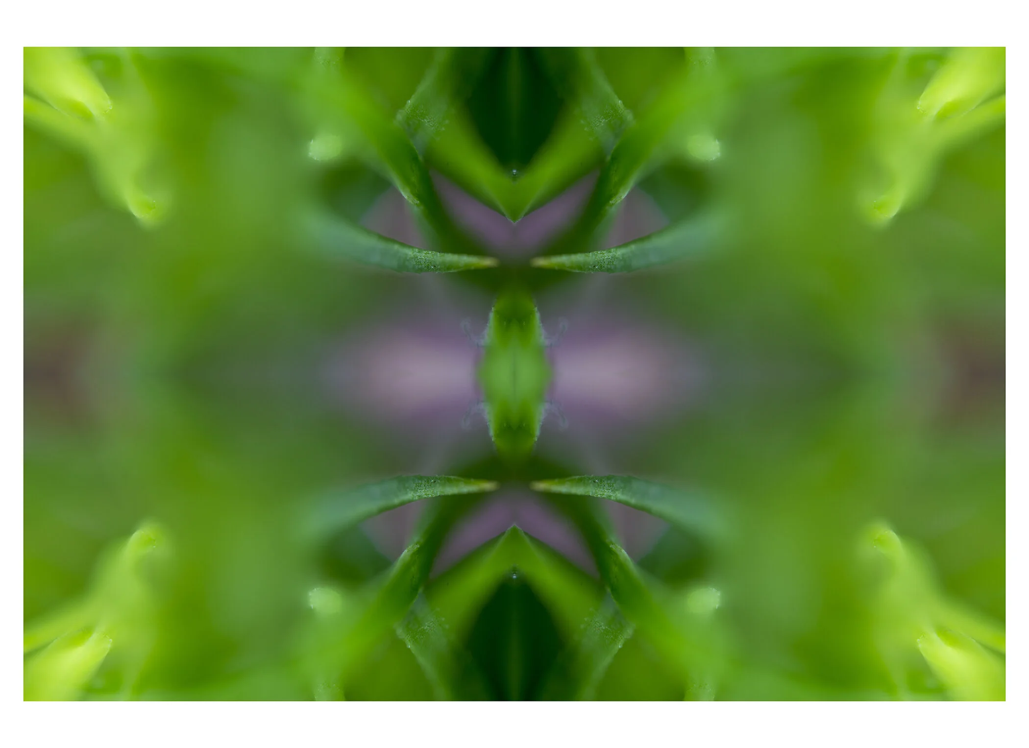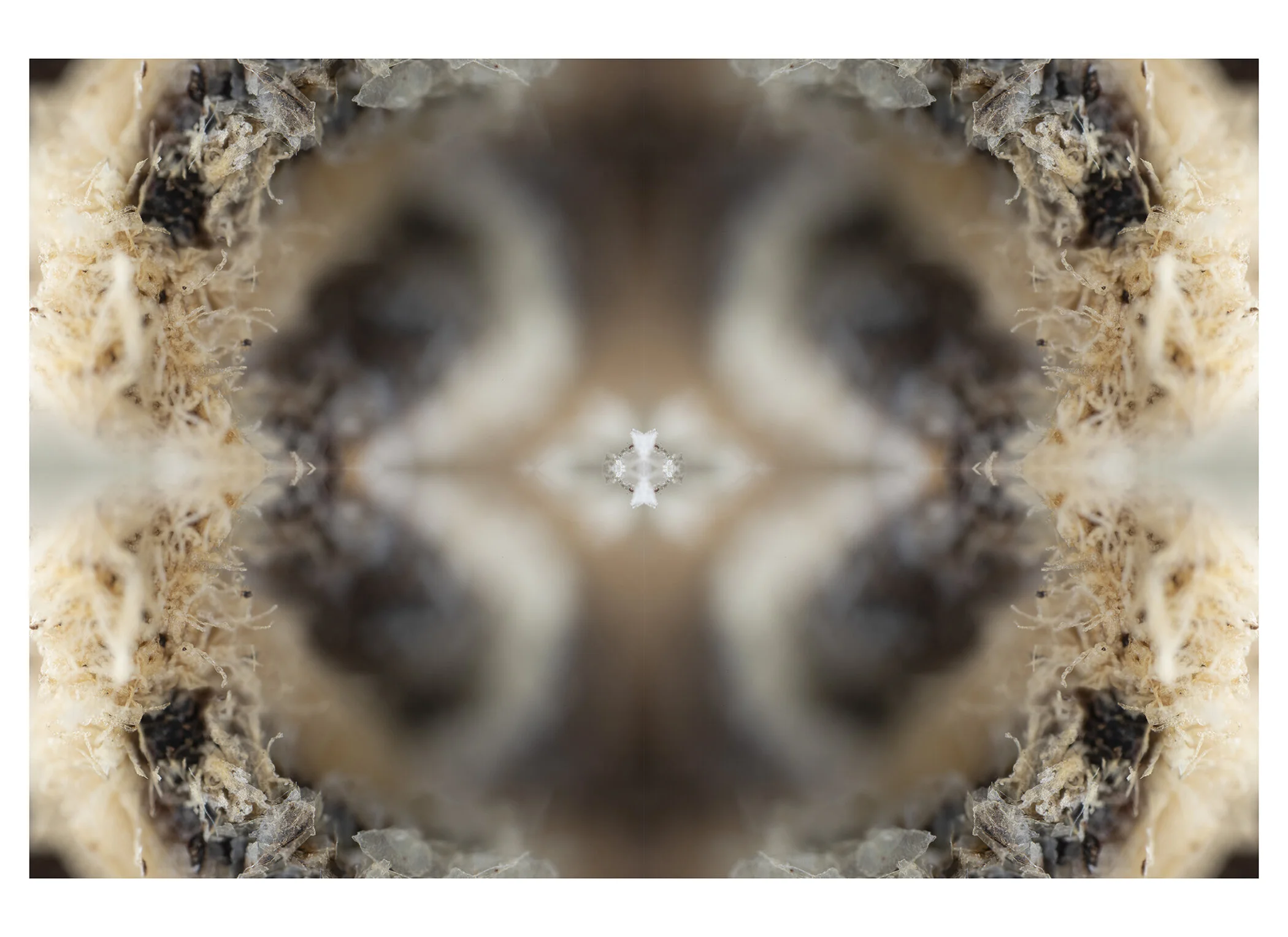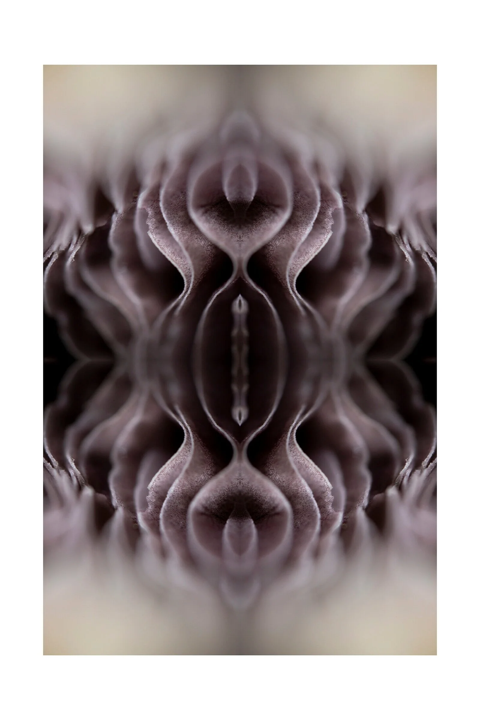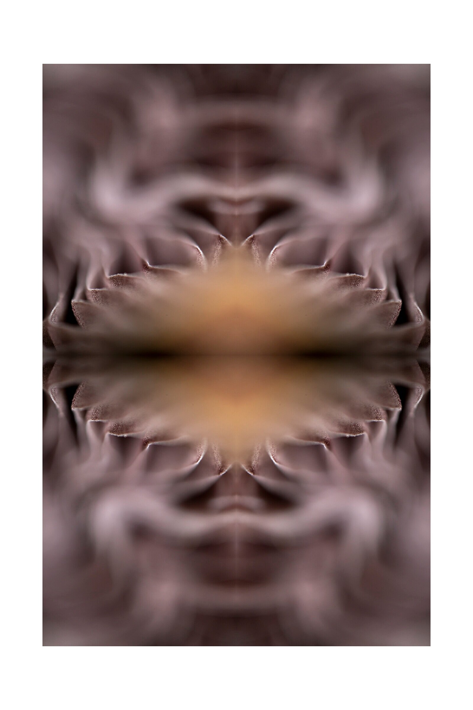 The Autonomous Entities series playfully explores the hidden depths and energies of the natural world. Created to emulate the geometric visuals occasioned by mystical experiences, these macro photographs are “mirrored,” digitally and symmetrically reflected, to reveal sacred geometric visuals or, perhaps, beings.