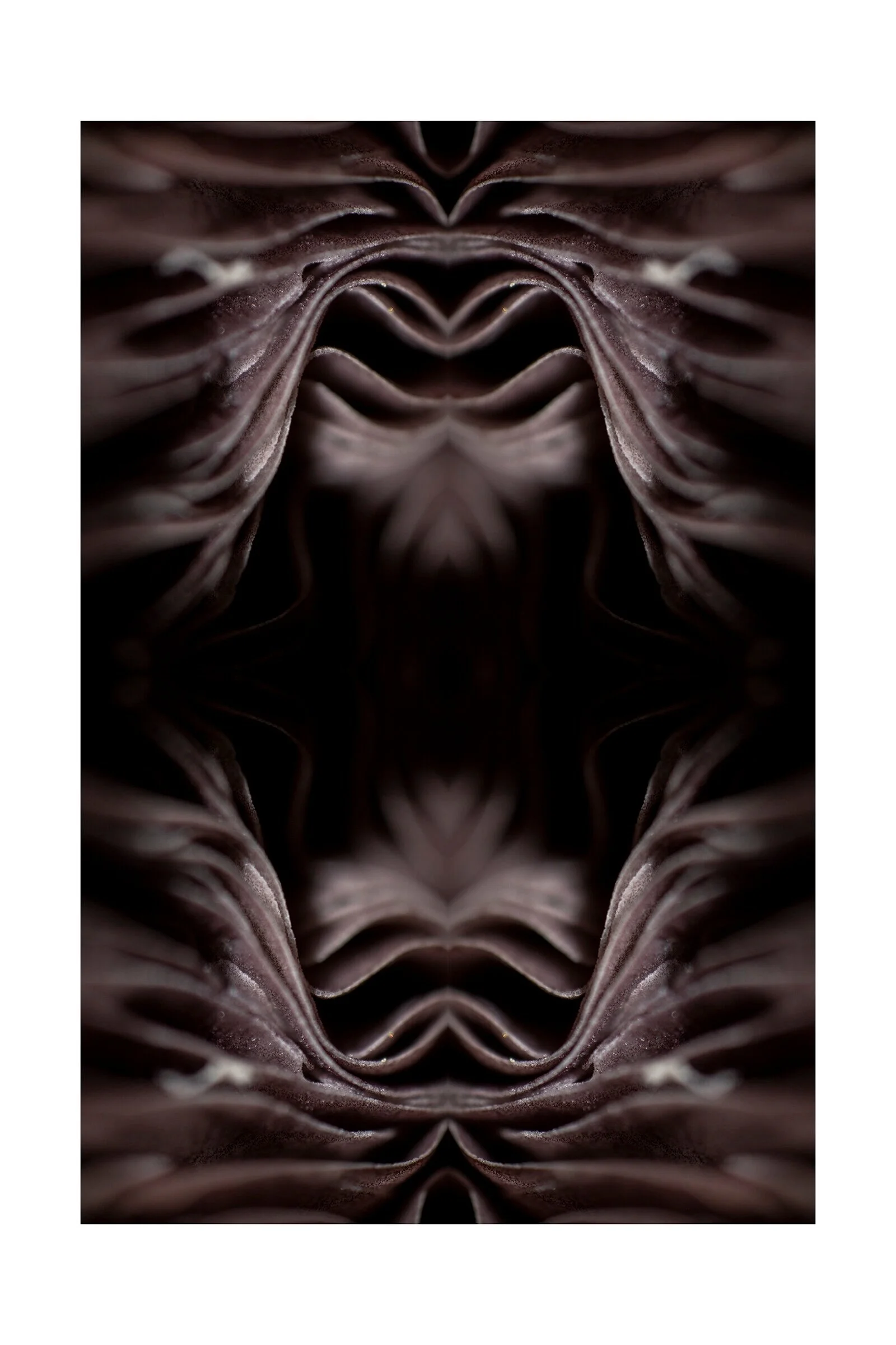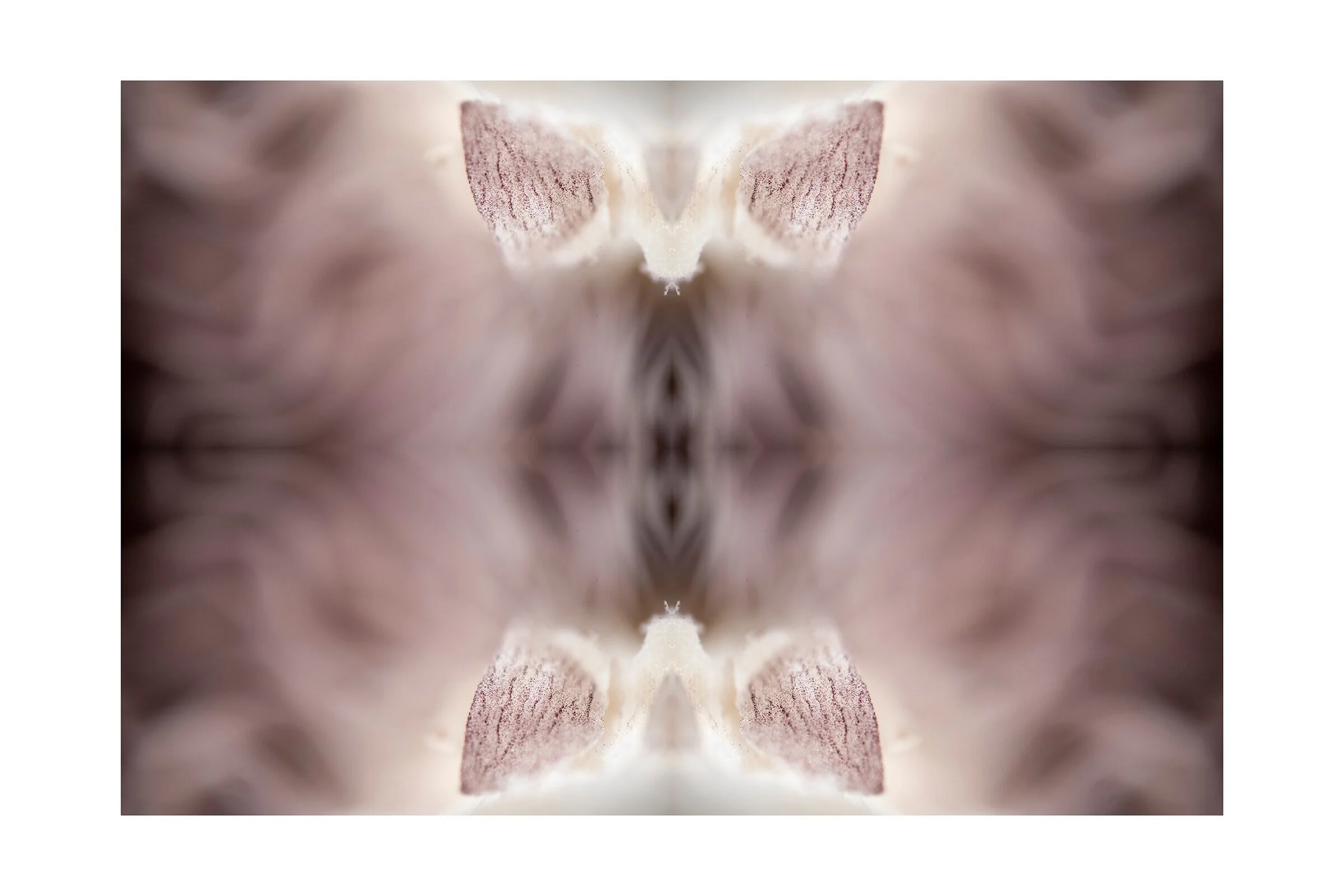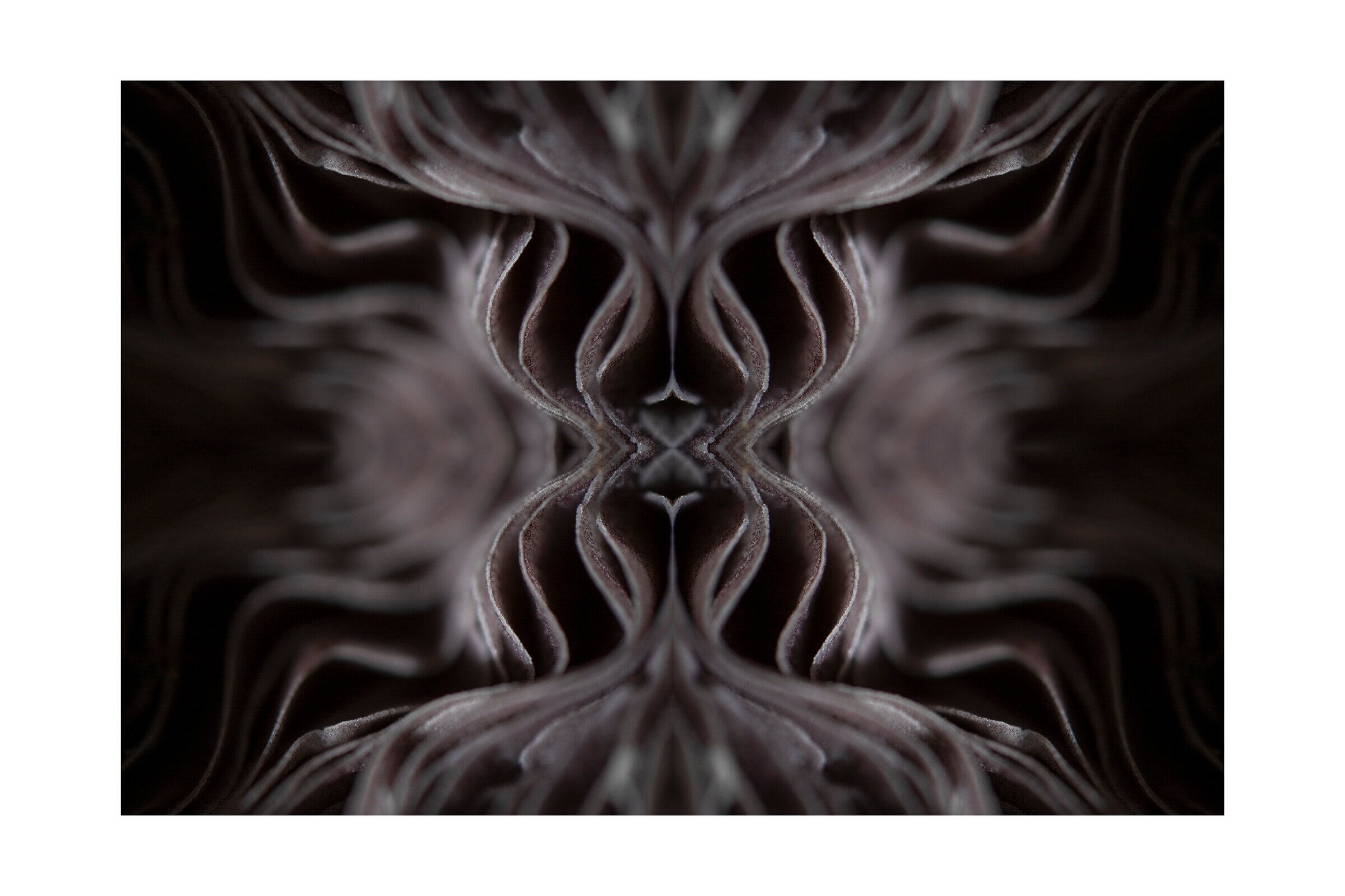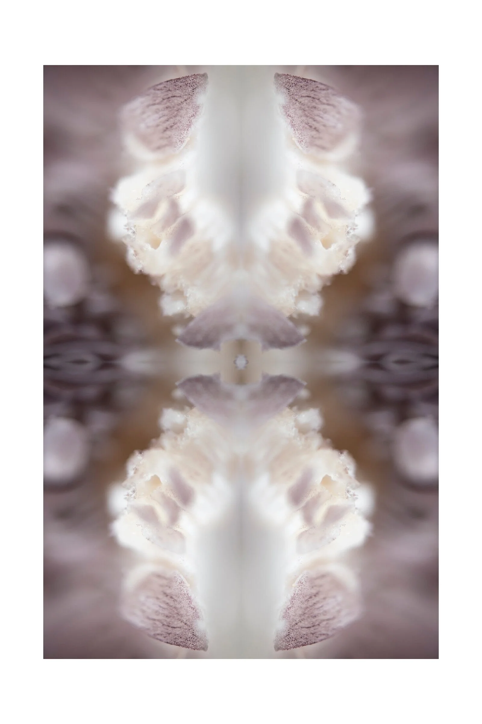 The Autonomous Entities series playfully explores the hidden depths and energies of the natural world. Created to emulate the geometric visuals occasioned by mystical experiences, these macro photographs are “mirrored,” digitally and symmetrically reflected, to reveal sacred geometric visuals or, perhaps, beings.