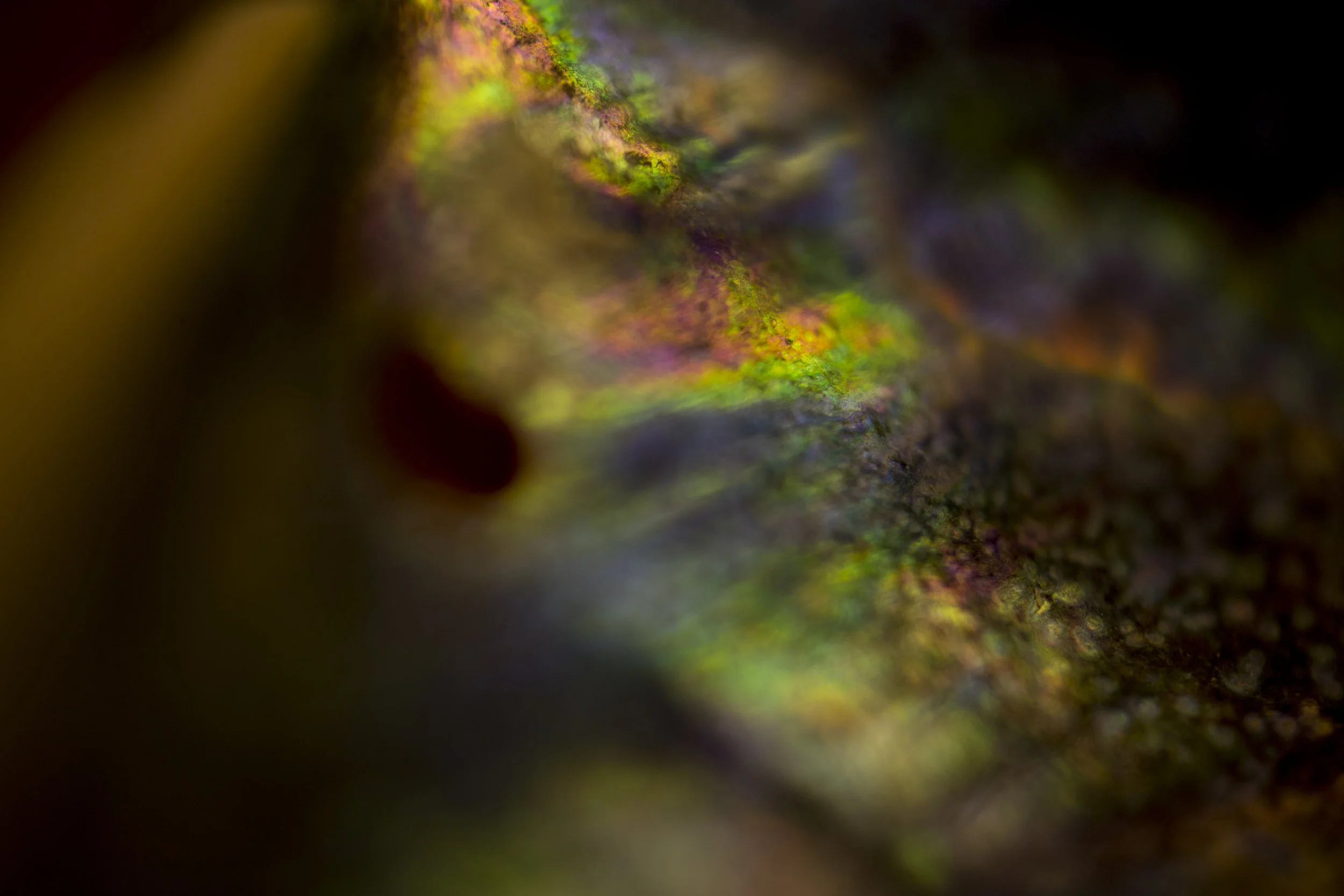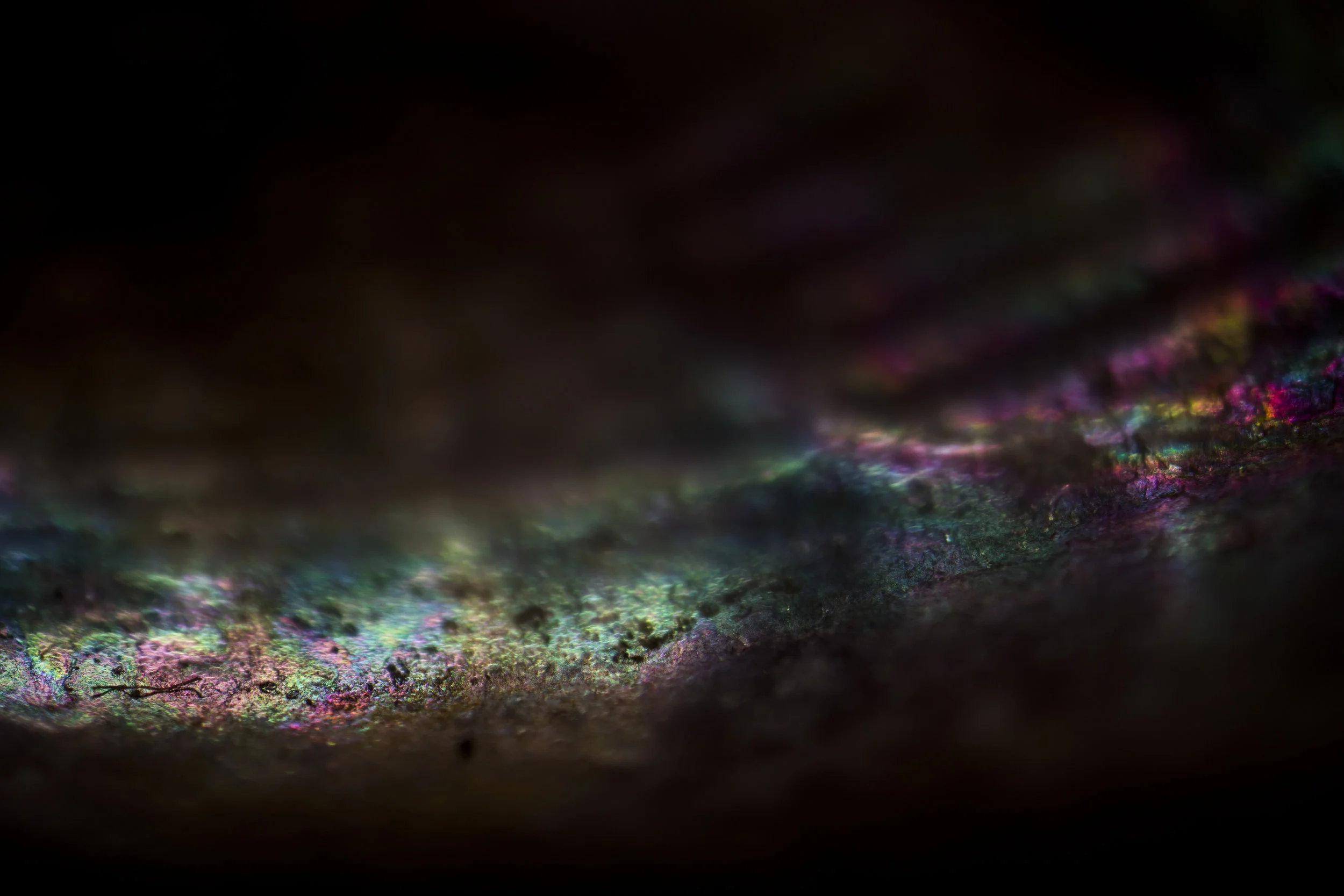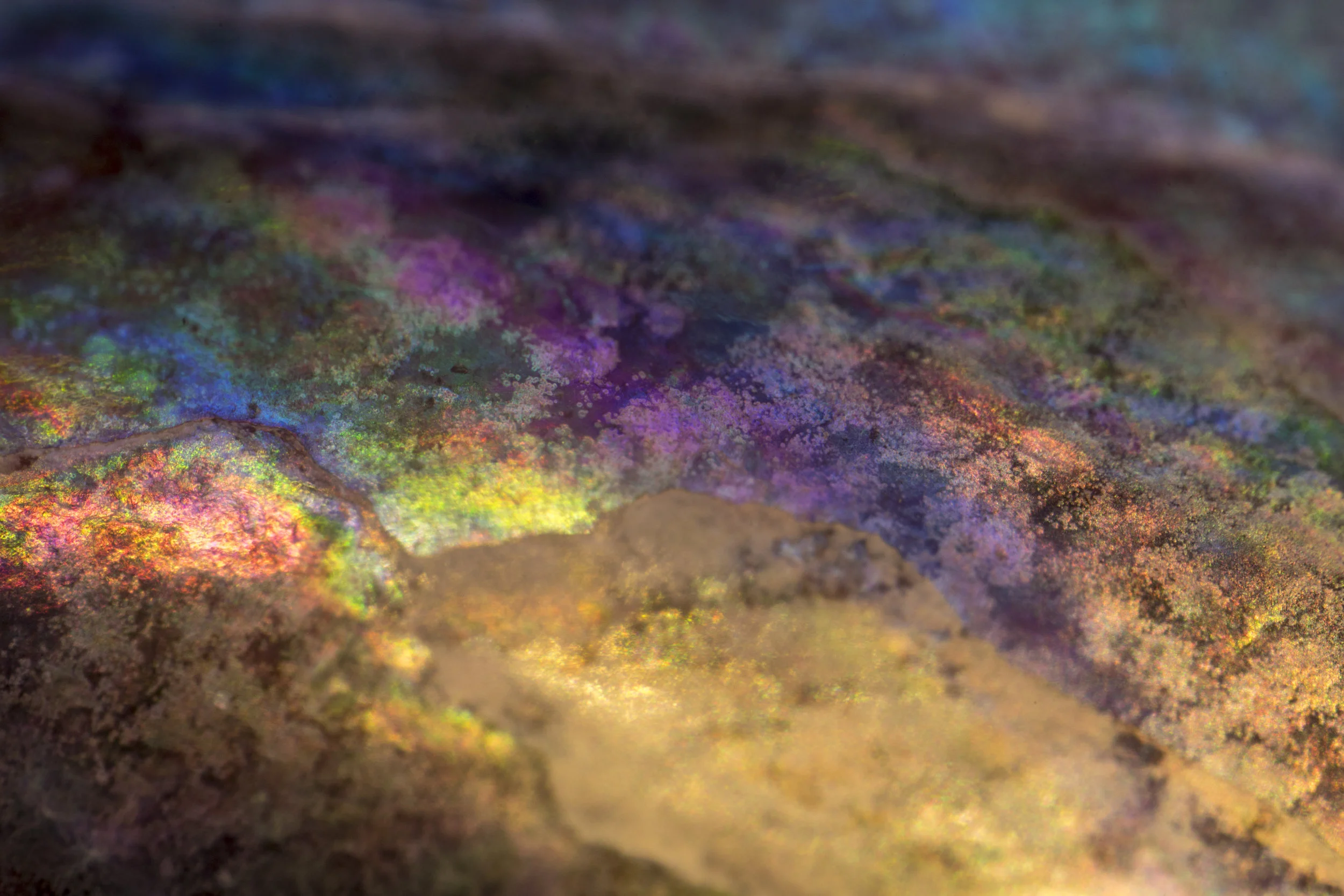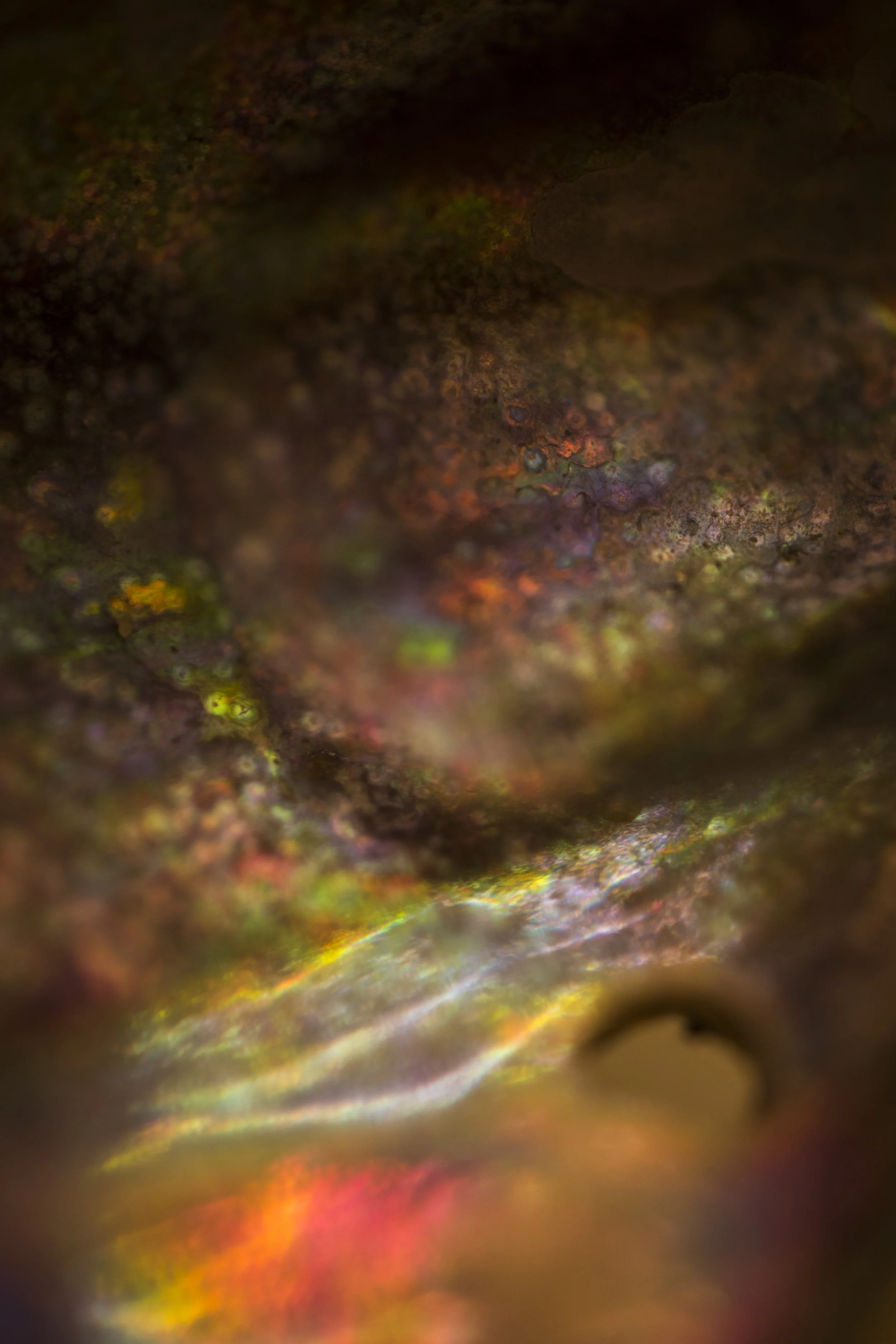 Images of shells’ iridescent colors, which are created by a thin matrix of stacked and layered tiles of crystalline polygons known as ‘natural diffraction grating’ and ‘multilayer interference.’
