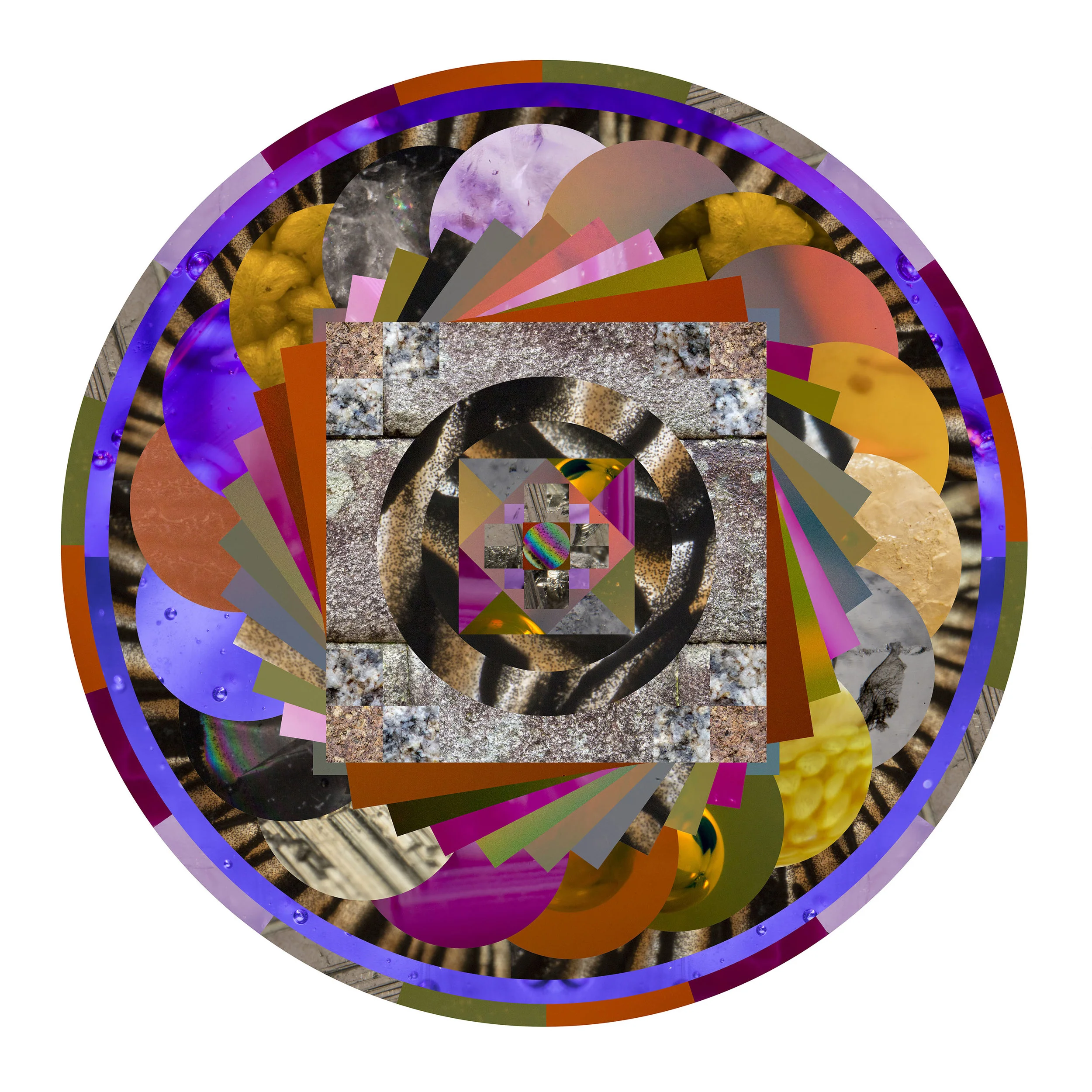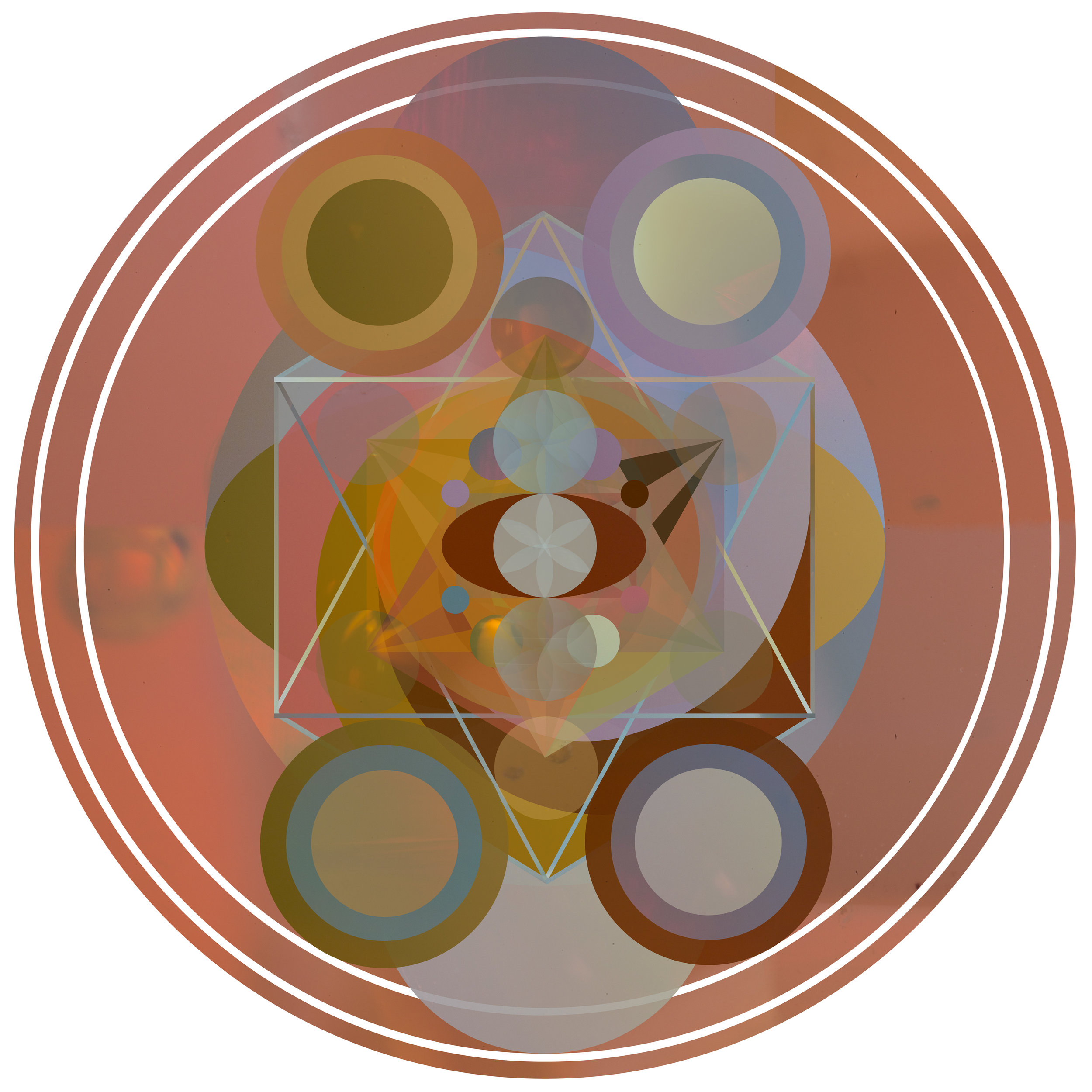 A labor of love, Geometric Beings are graphic portraits of loved ones, as experienced by the artist. Created out of layers and layers of photographs, these digital-collages represent the spirit, the being, of a given person or place. Each is created under the parameters of sacred geometry and the principles of mandalas, then handed over to a more intuitive way of working. These mandalas, while longer lasting than their Tibetan cousins, are as fleeting as the ones they represent; still sand, still dust, still impermanent.